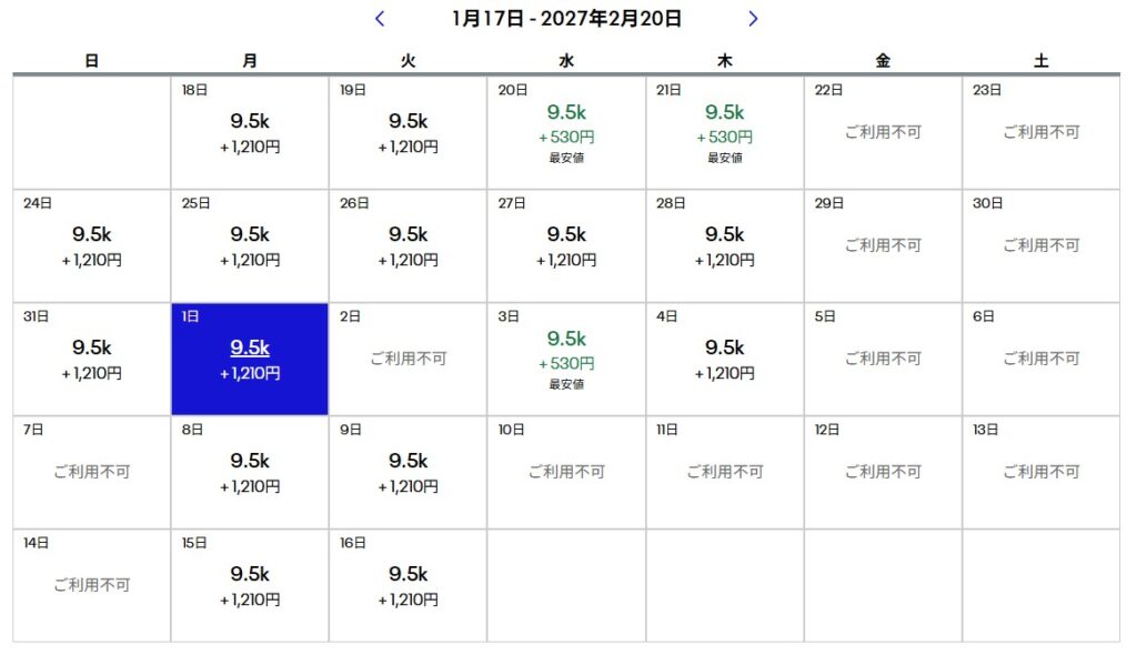 実際の検索結果のスクショで。9.5kの表示があるところが特典航空券予約できる日です。